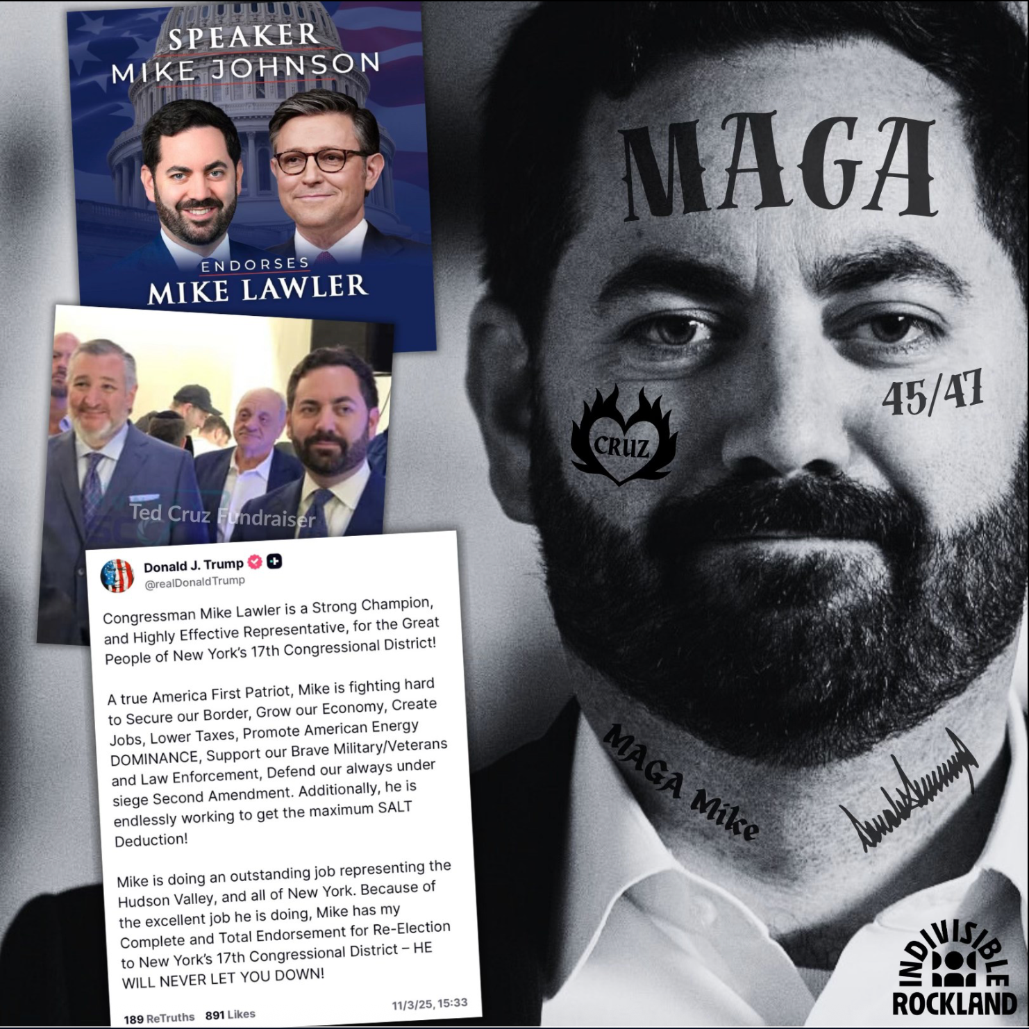 Mike Lawler is a Republican congressman from New York’s Lower Hudson Valley, seeking a third term in a purple “toss-up” district. Despite frequent claims to be bi-partisan, Lawler has a 100% MAGA voting record.